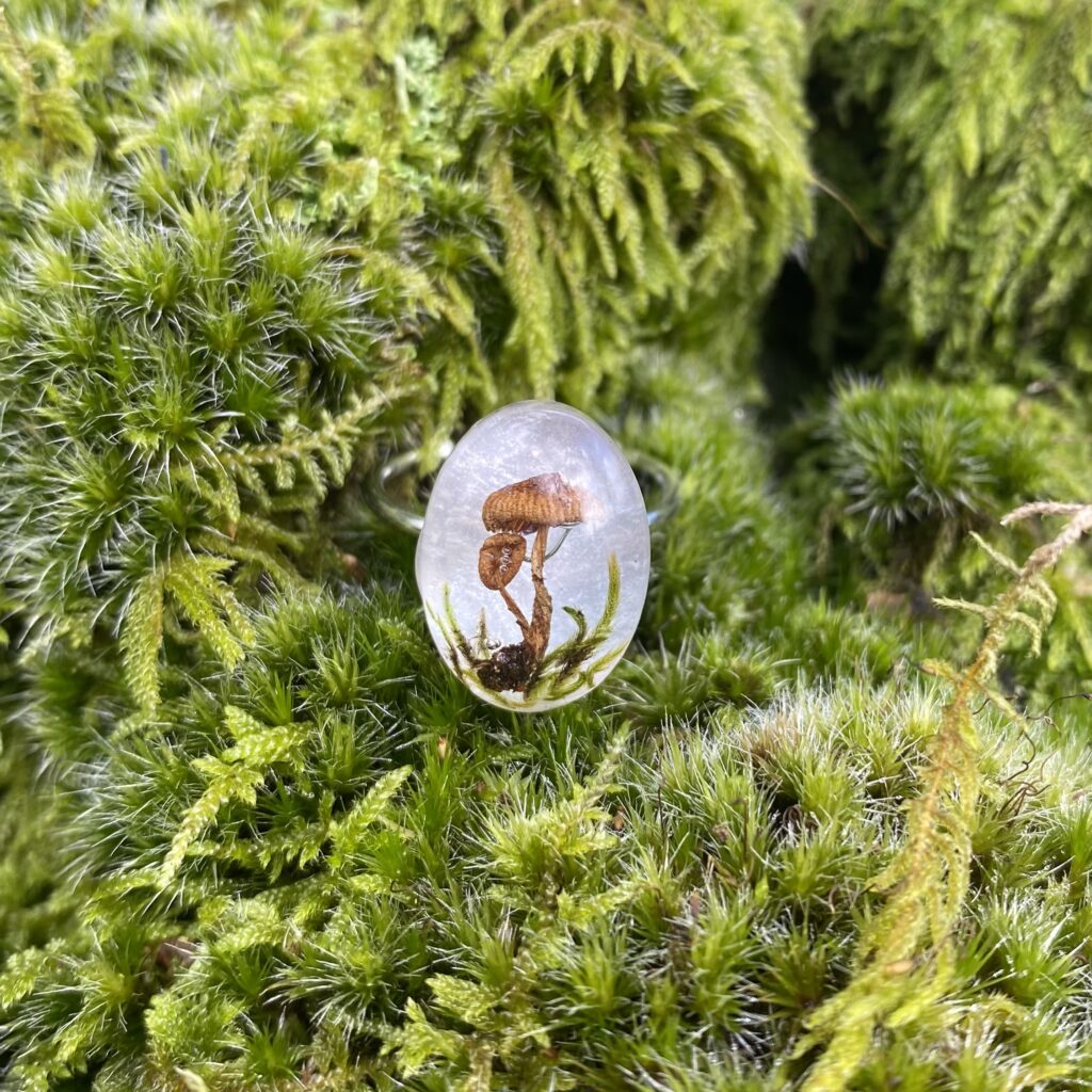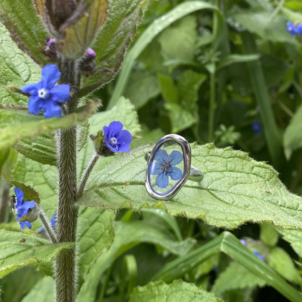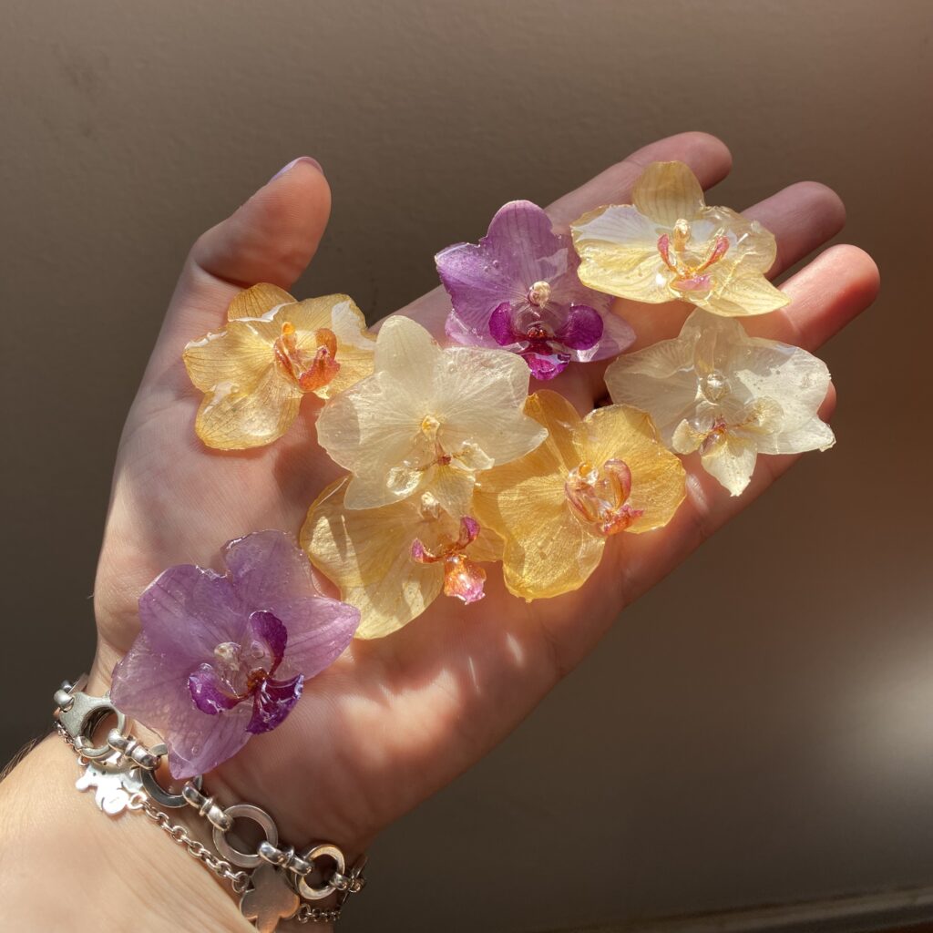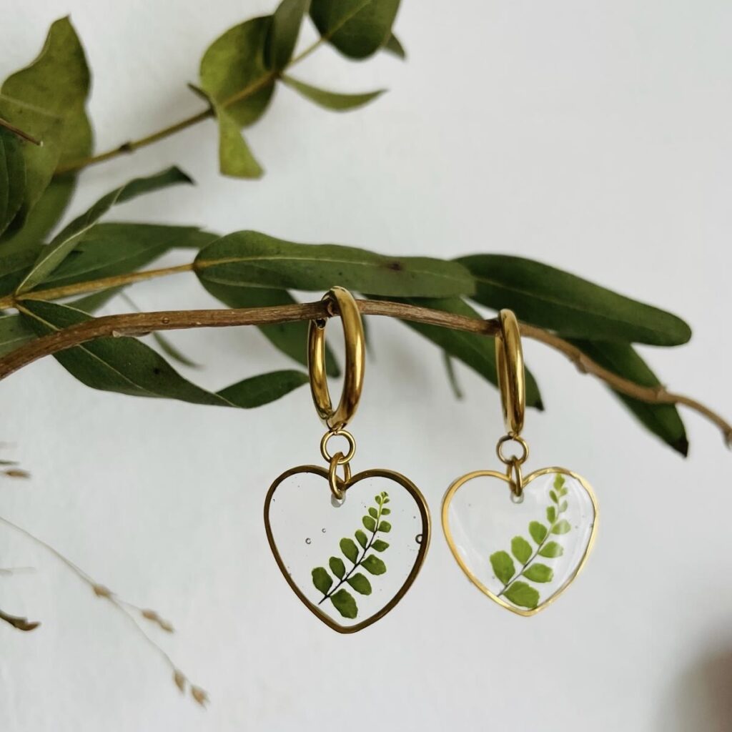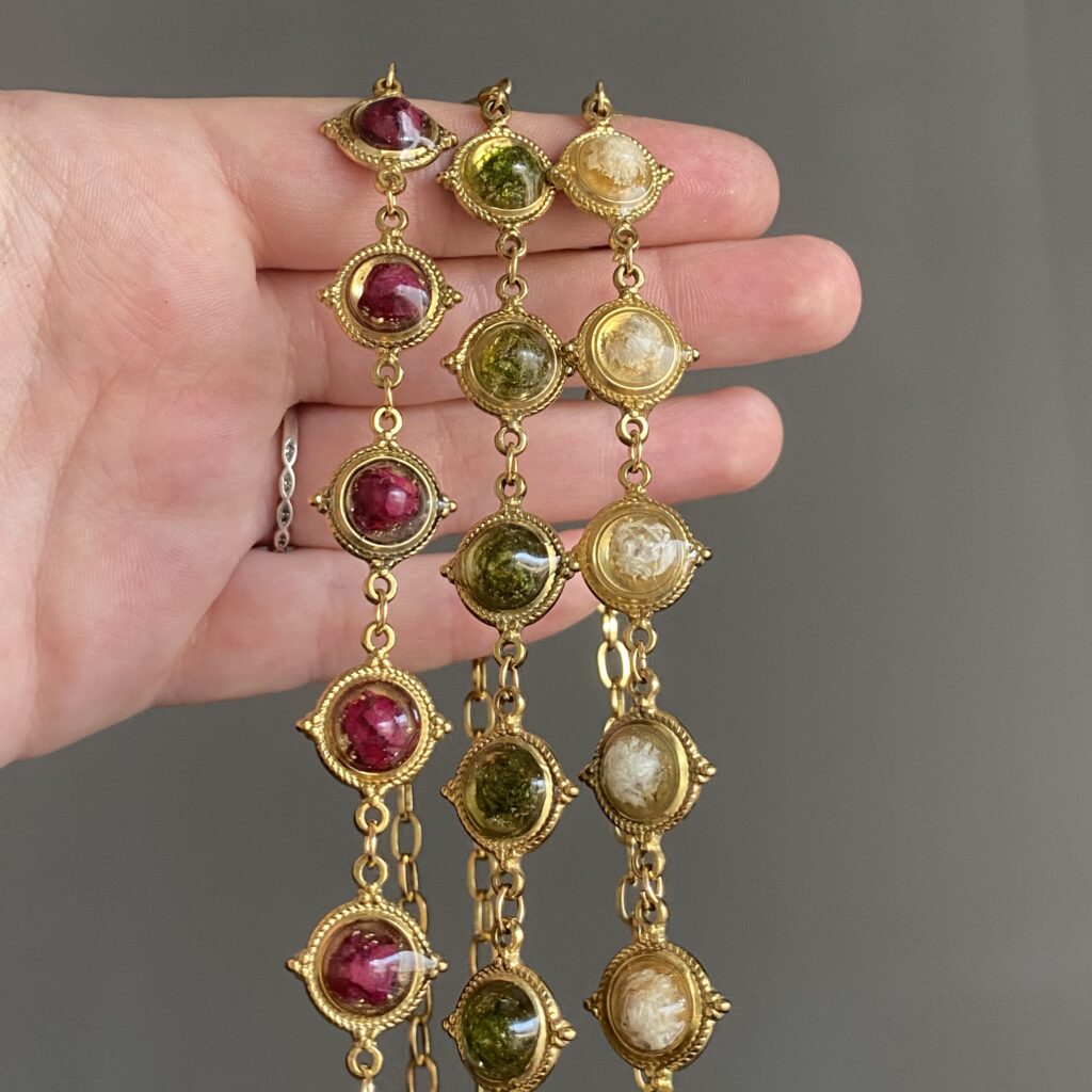 Cada pieza está hecha con flores y plantas naturales, recolectadas por mí o enviadas por quienes quieren guardar un recuerdo especial. Las seco con delicadeza para preservar su forma y color, y luego las encapsulo en resina, trabajando cada joya a mano.