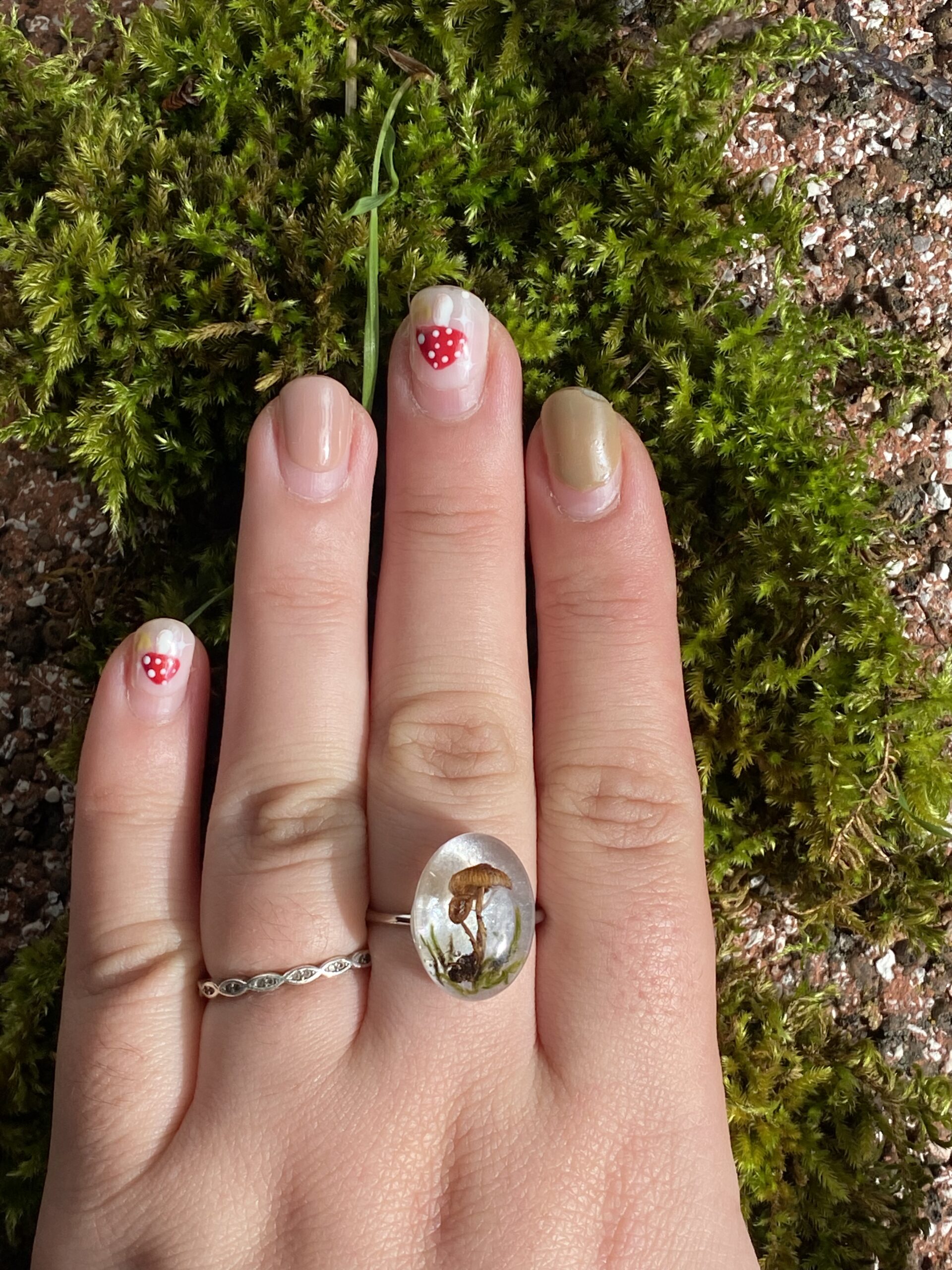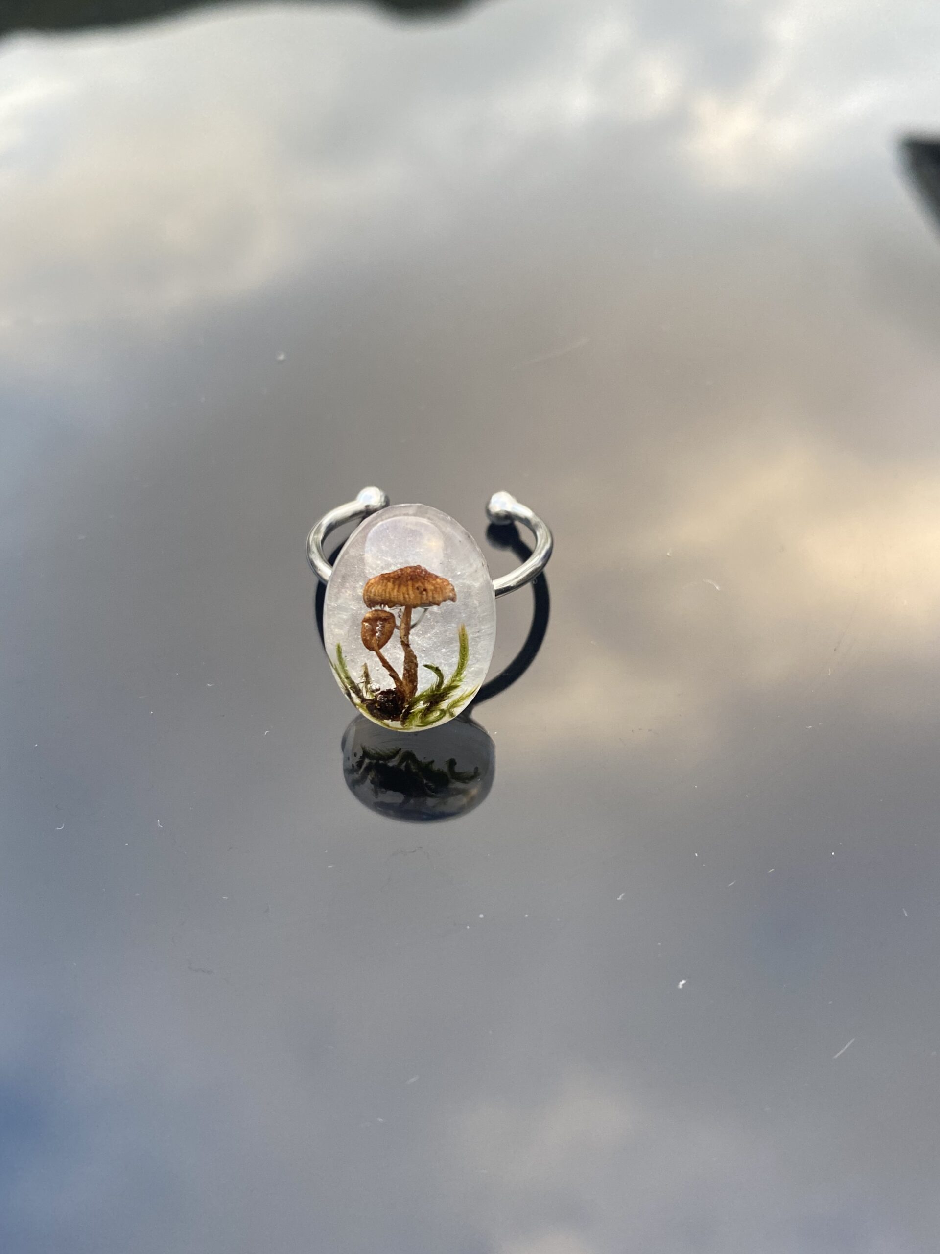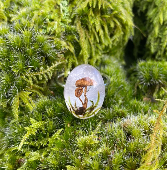Anillo ajustable hecho con setas y musgo (cultivado) reales.