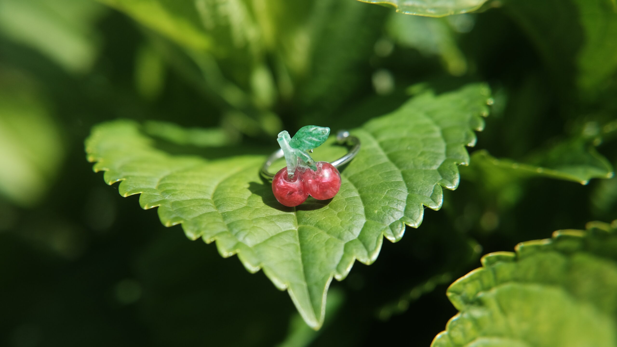 Anillo ajustable de cereza hecho con la flor de paniculata roja y verde.