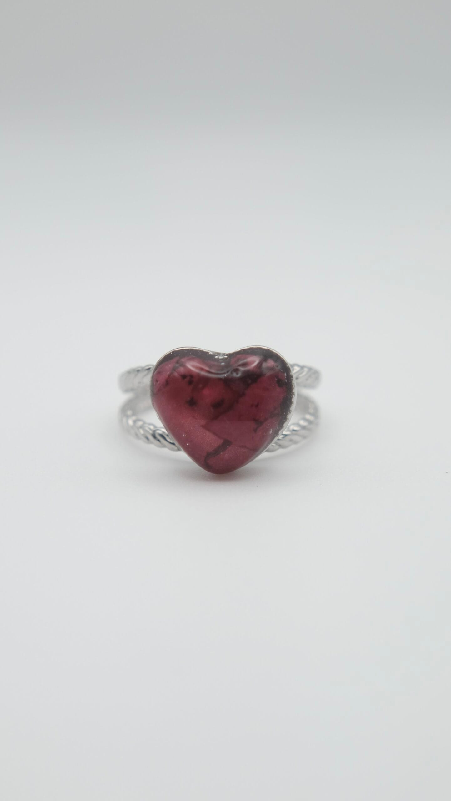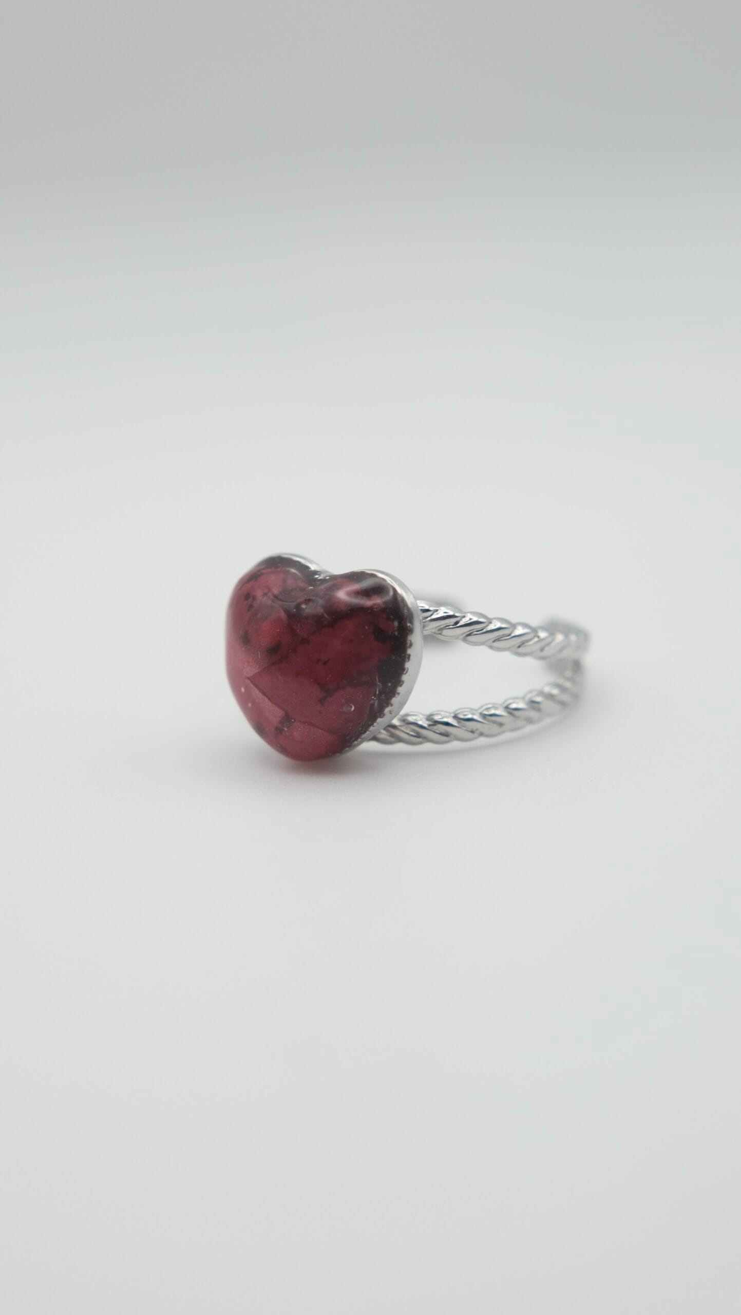 Anillo ajustable en forma de corazón hecho con pétalos de rosa roja.