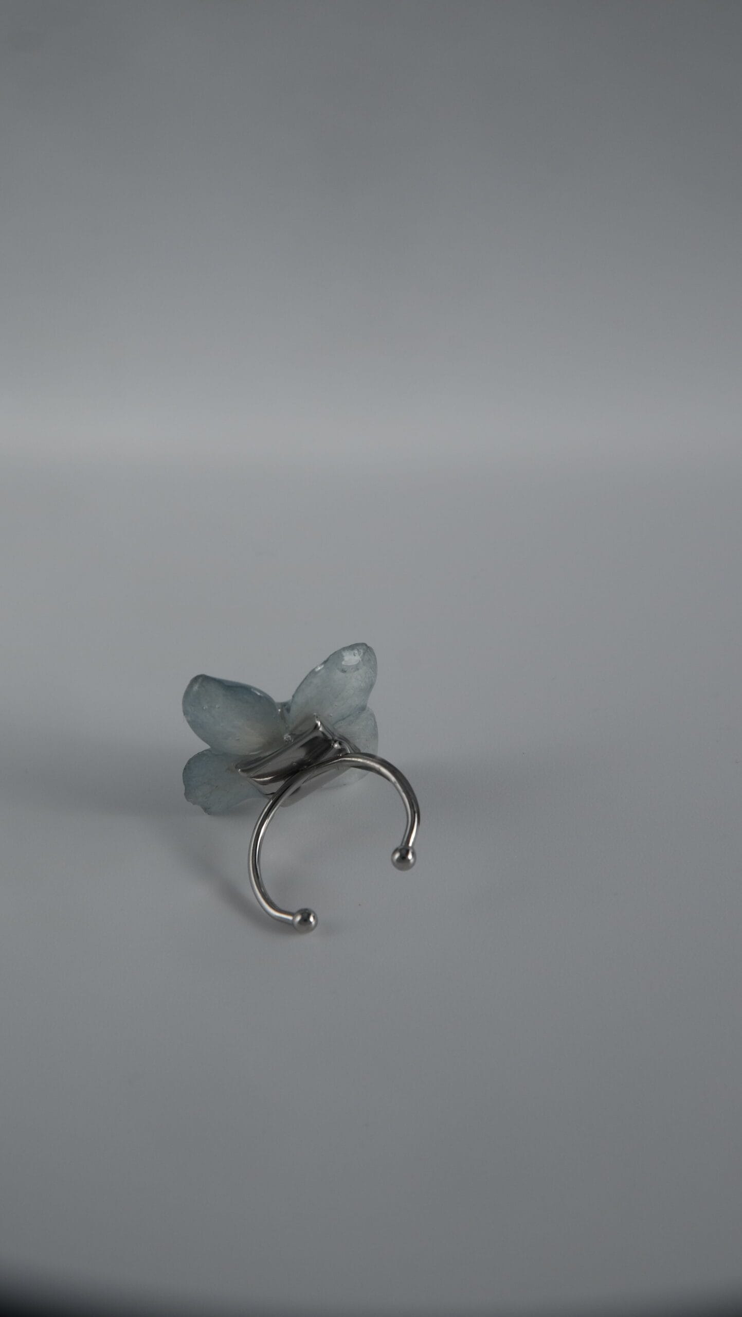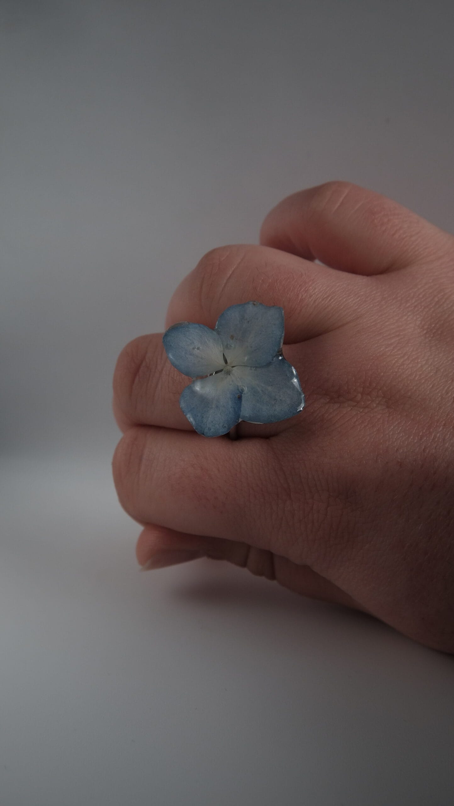 Anillo hecho con un pétalo de hortensia azul real.