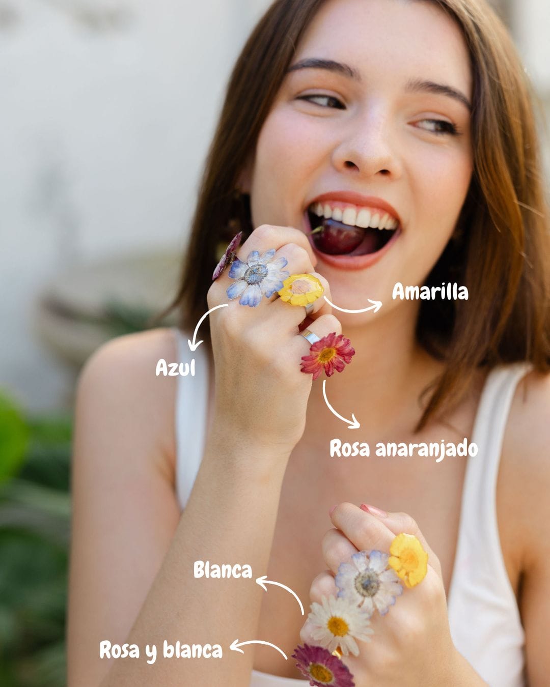 Anillos ajustables de margaritas reales encapsuladas en resina.
