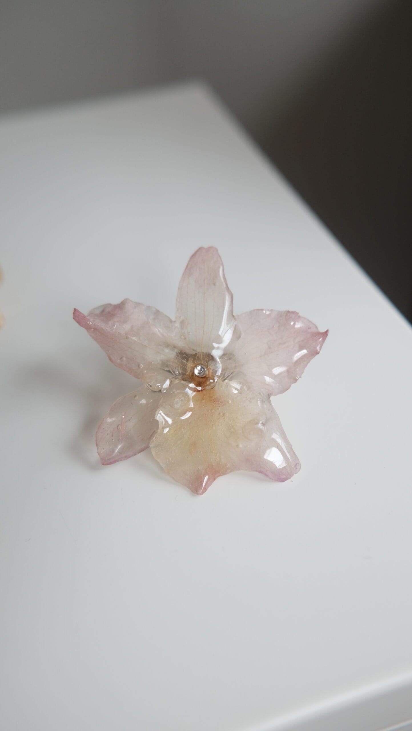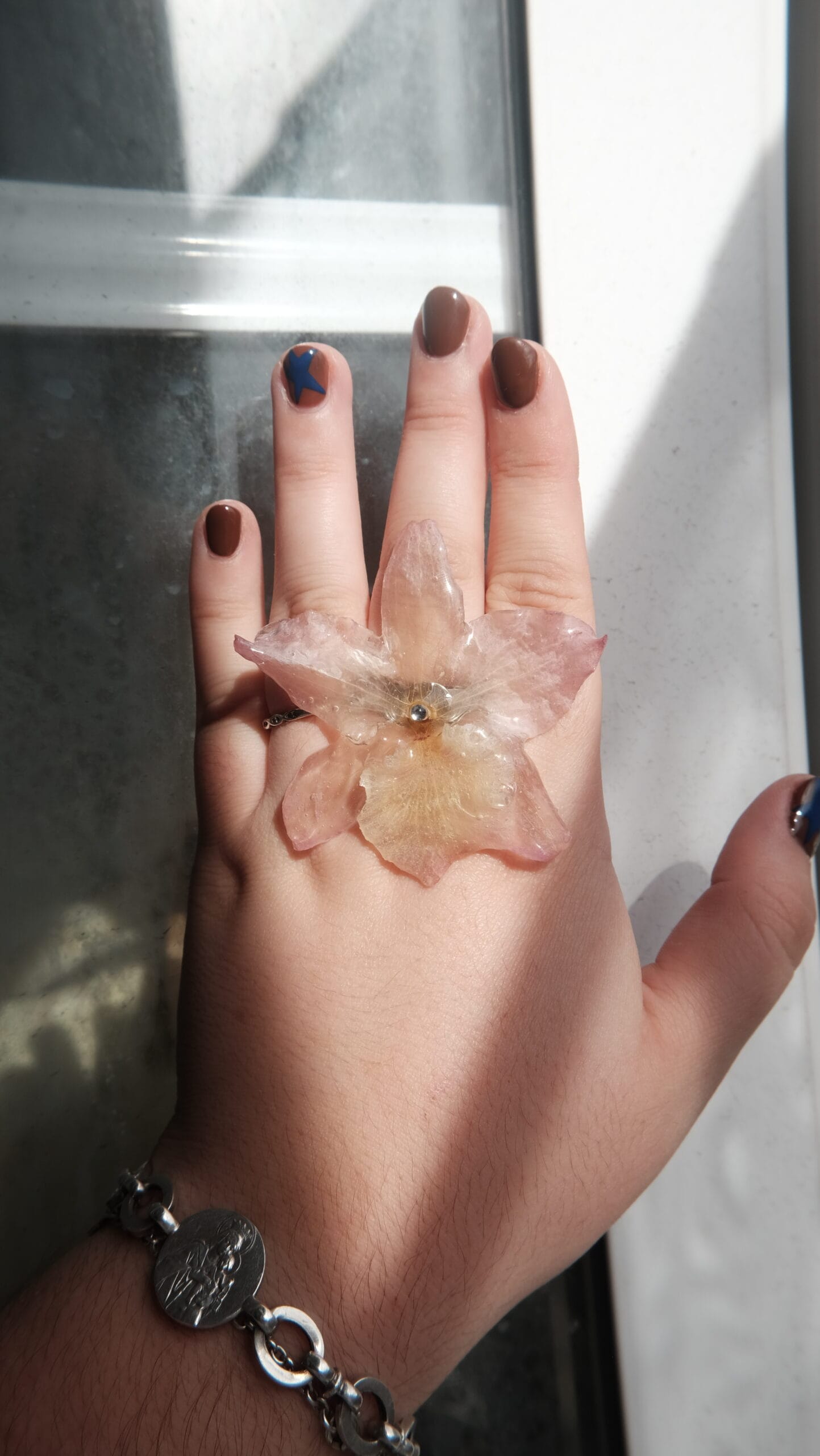 Anillo ajustable hecho con una orquídea dendrobium real. Con un brillo en el centro.