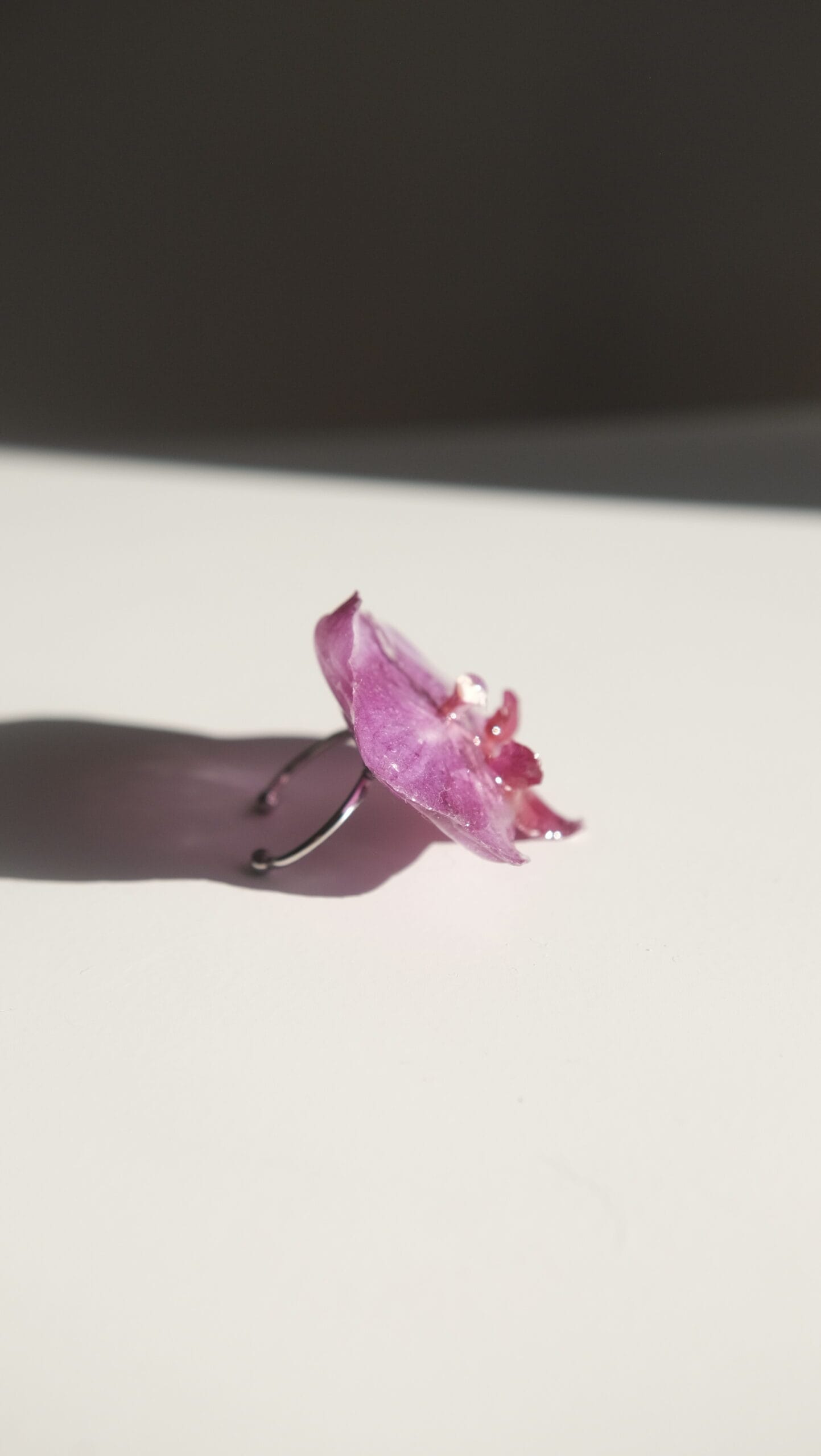 Anillo hecho con una orquídea phalaenopsis morada oscura real.