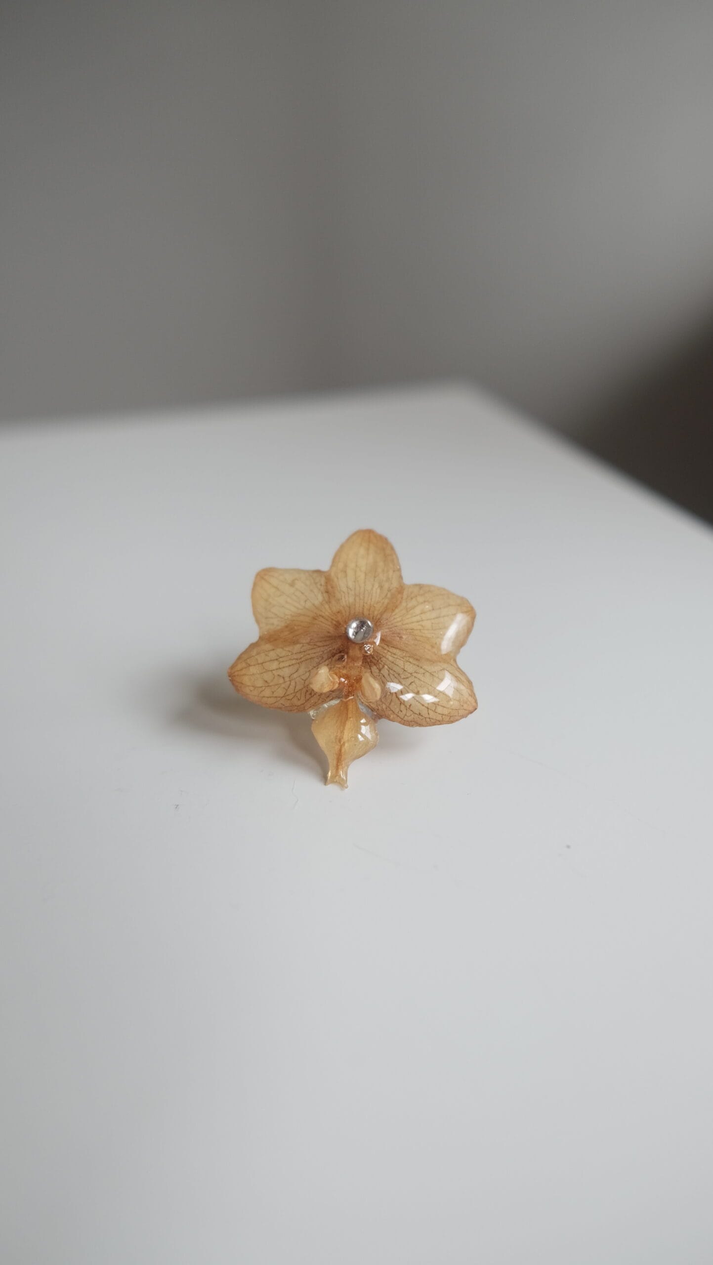 Anillo (plateado) ajustable hecho con una orquídea phalaenopsis amarilla real. Con un brillo en el centro.