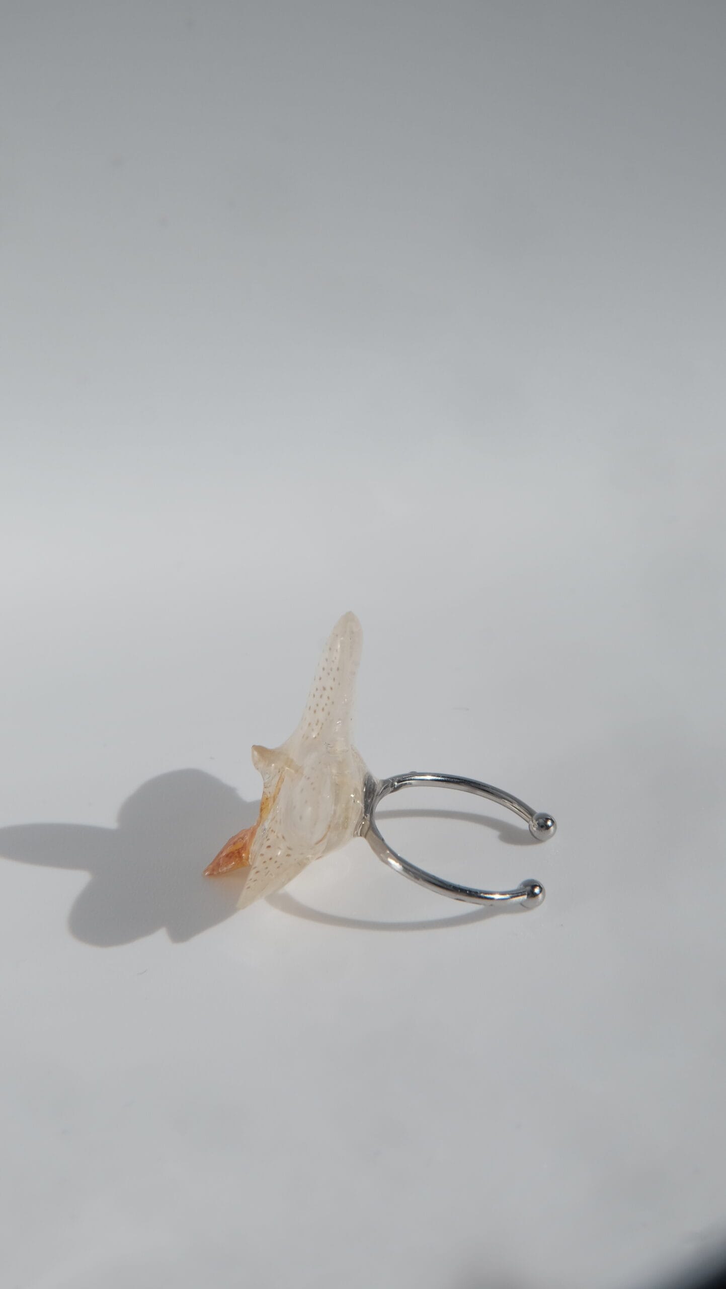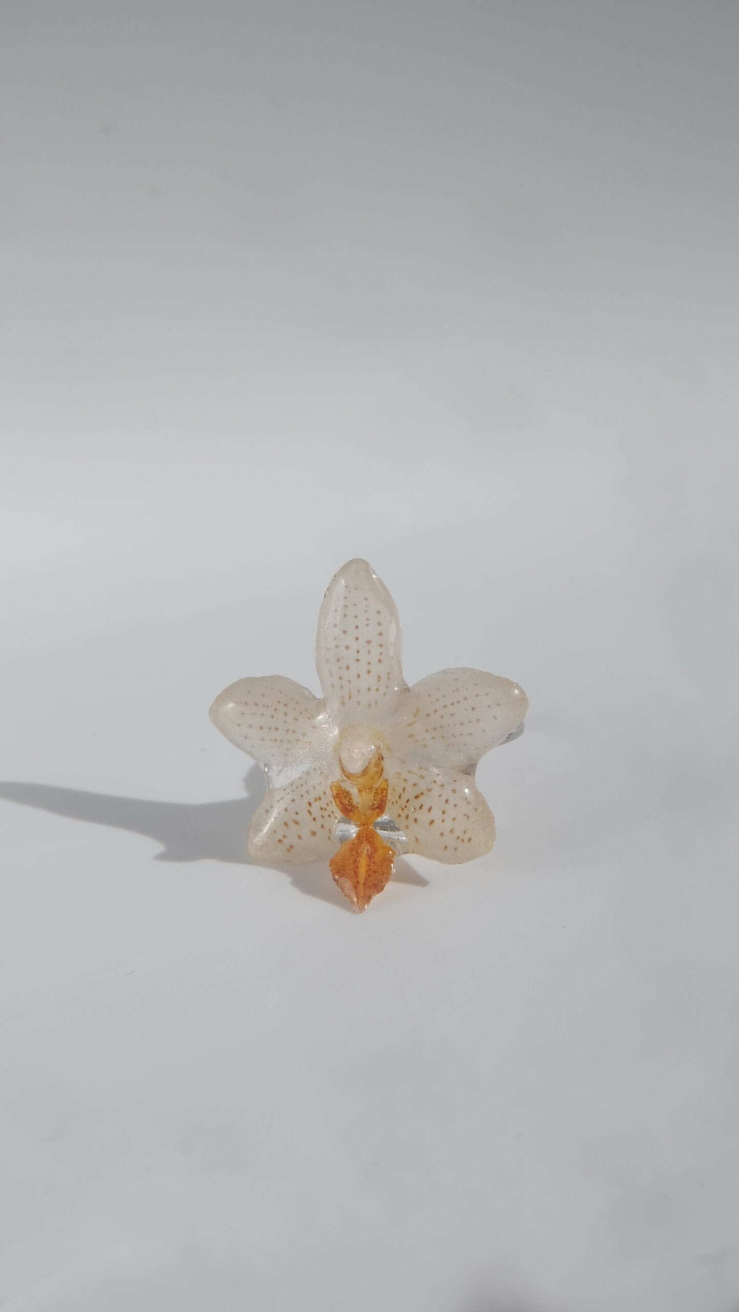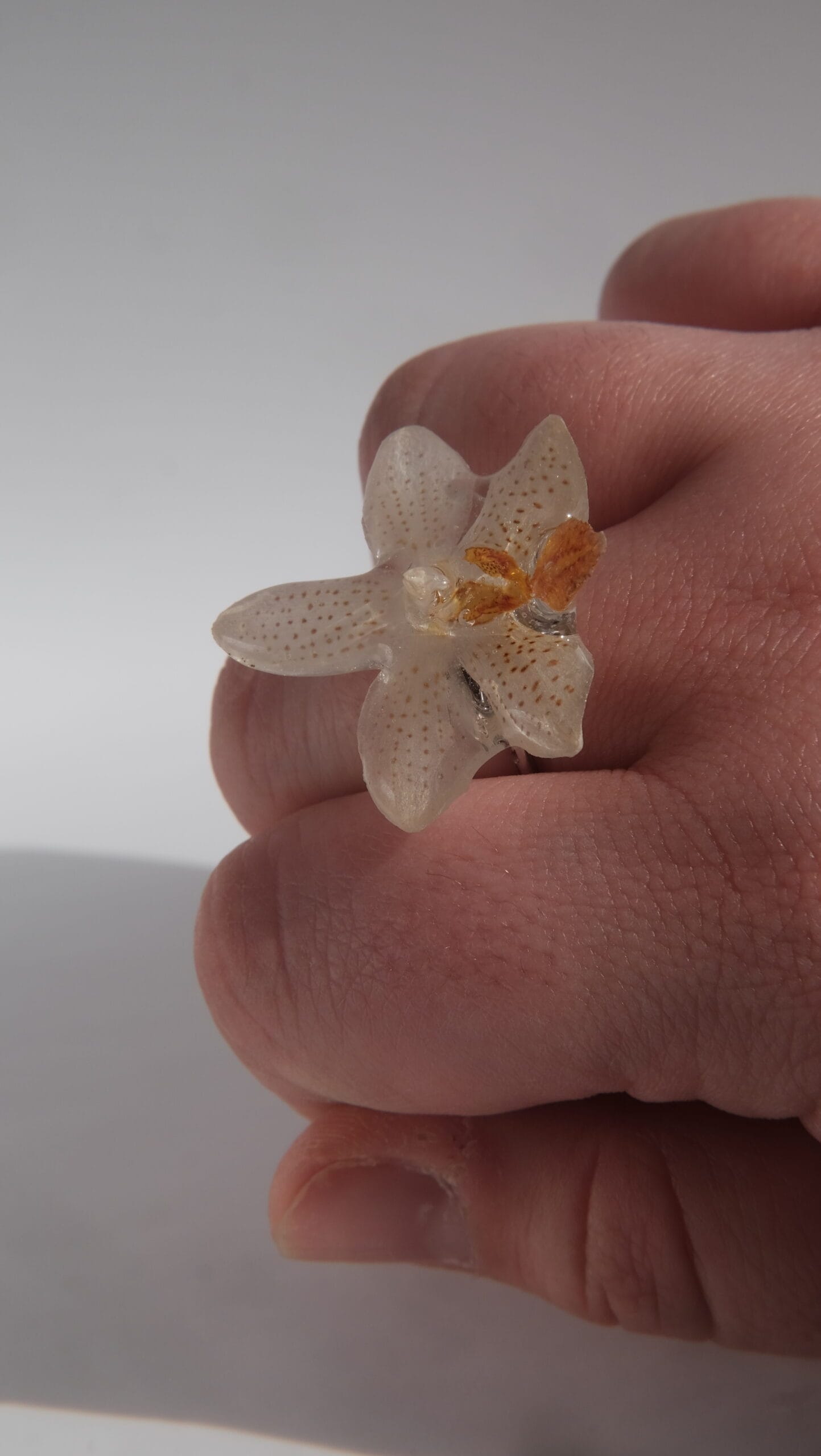 Anillo ajustable hecho con una orquídea phalaenopsis mini blanca y naranja.