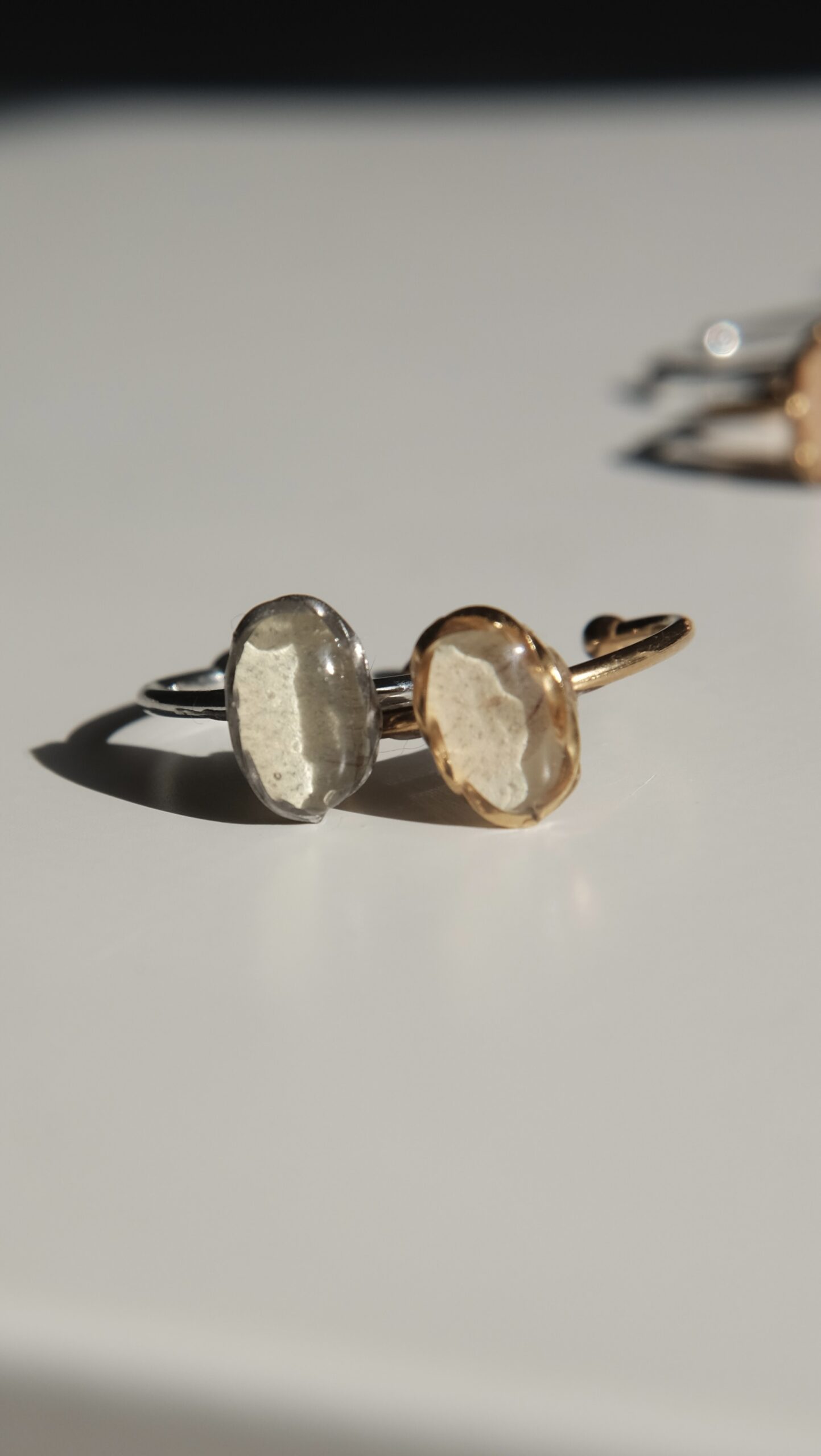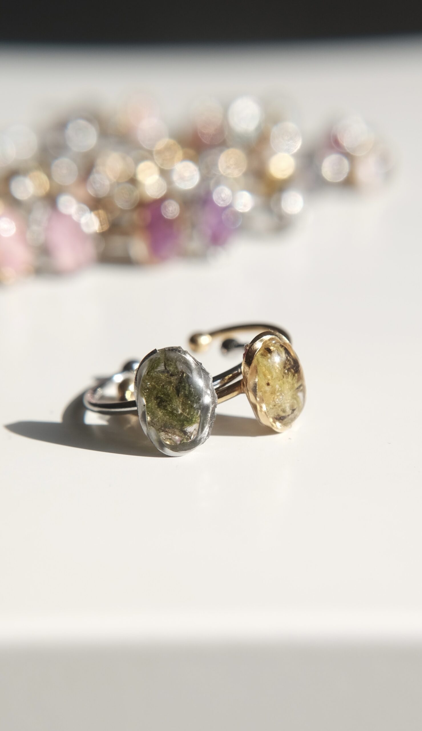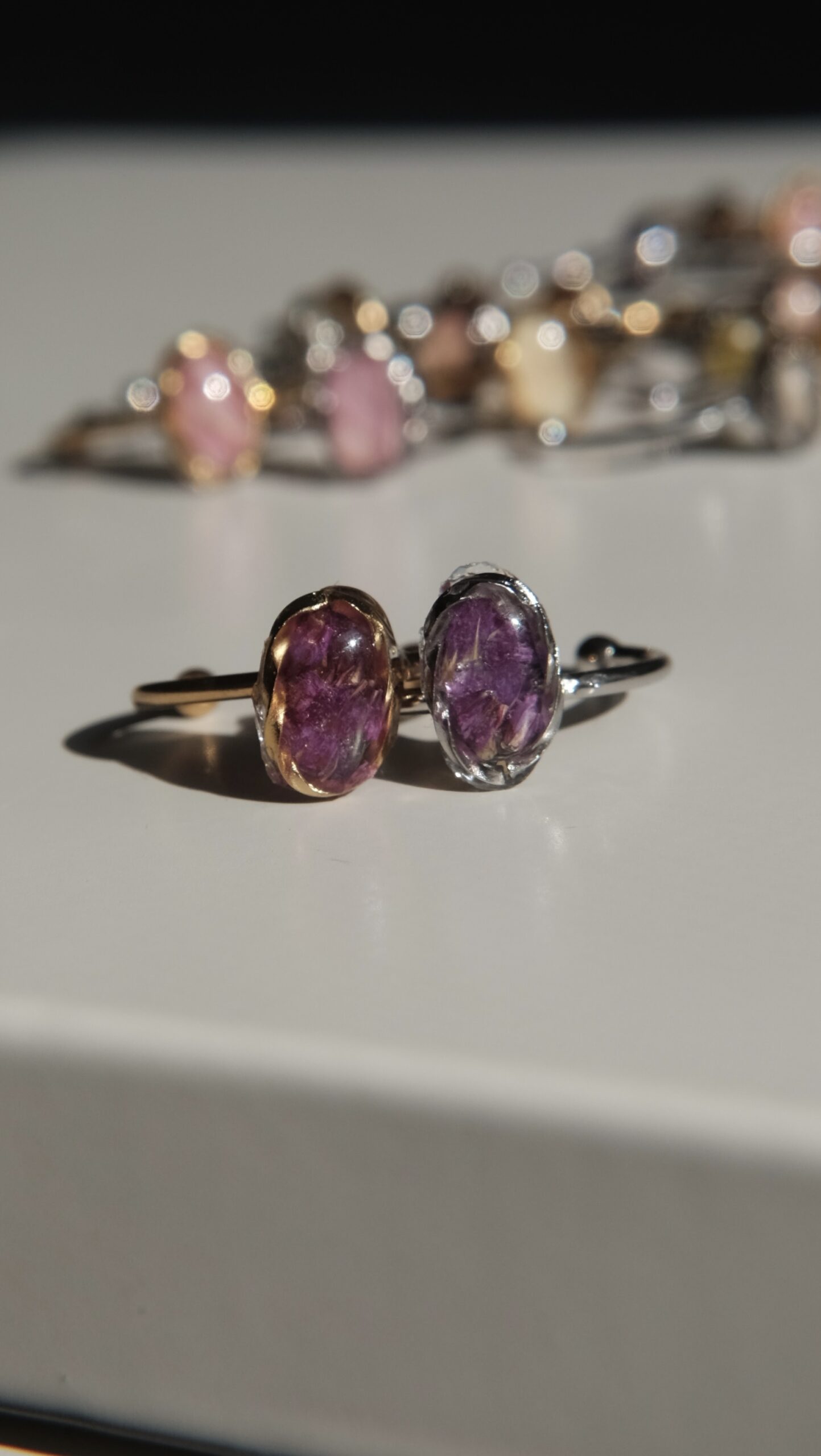 Anillos ajustables hechos con pétalos de diferentes elementos naturales.