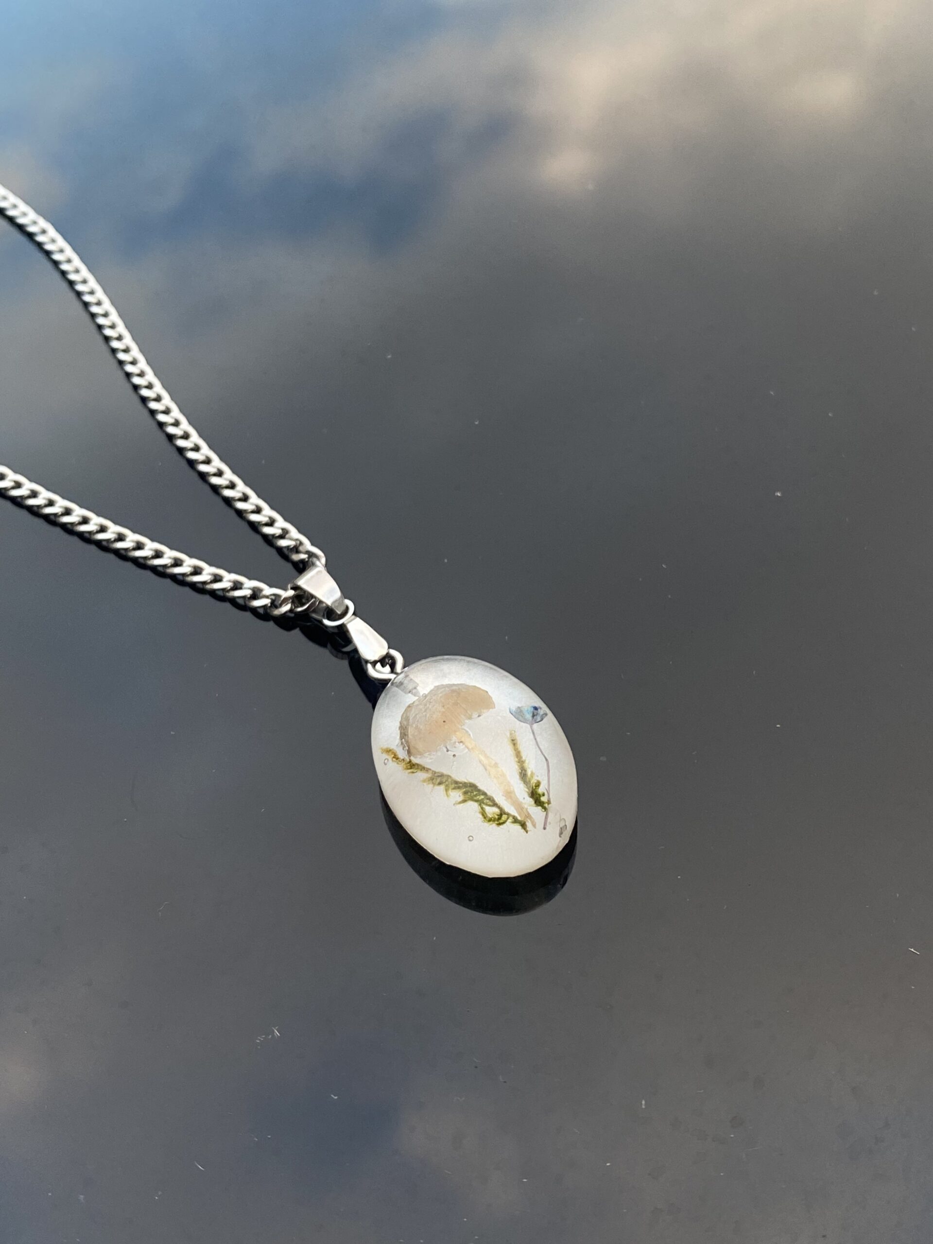 Collar hecho con setas y musgo (cultivado) reales.