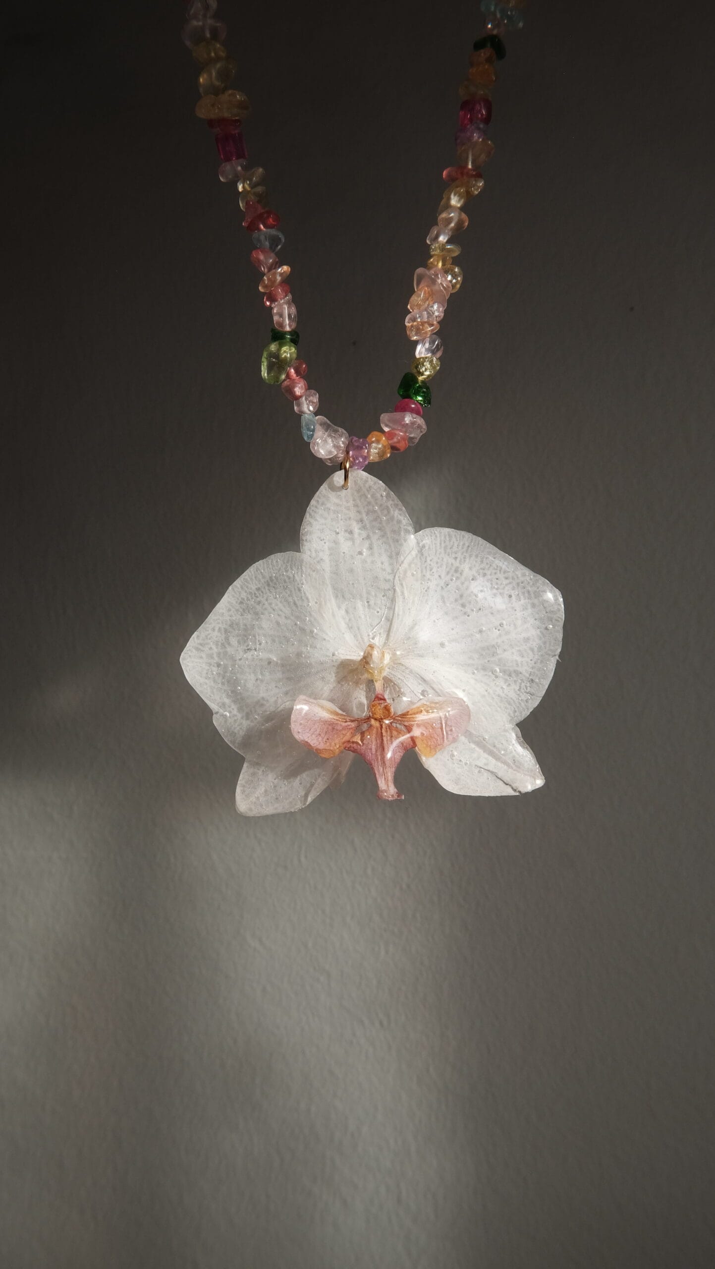 Collar hecho con una orquídea phalaenopsis blanca y rosa real.
