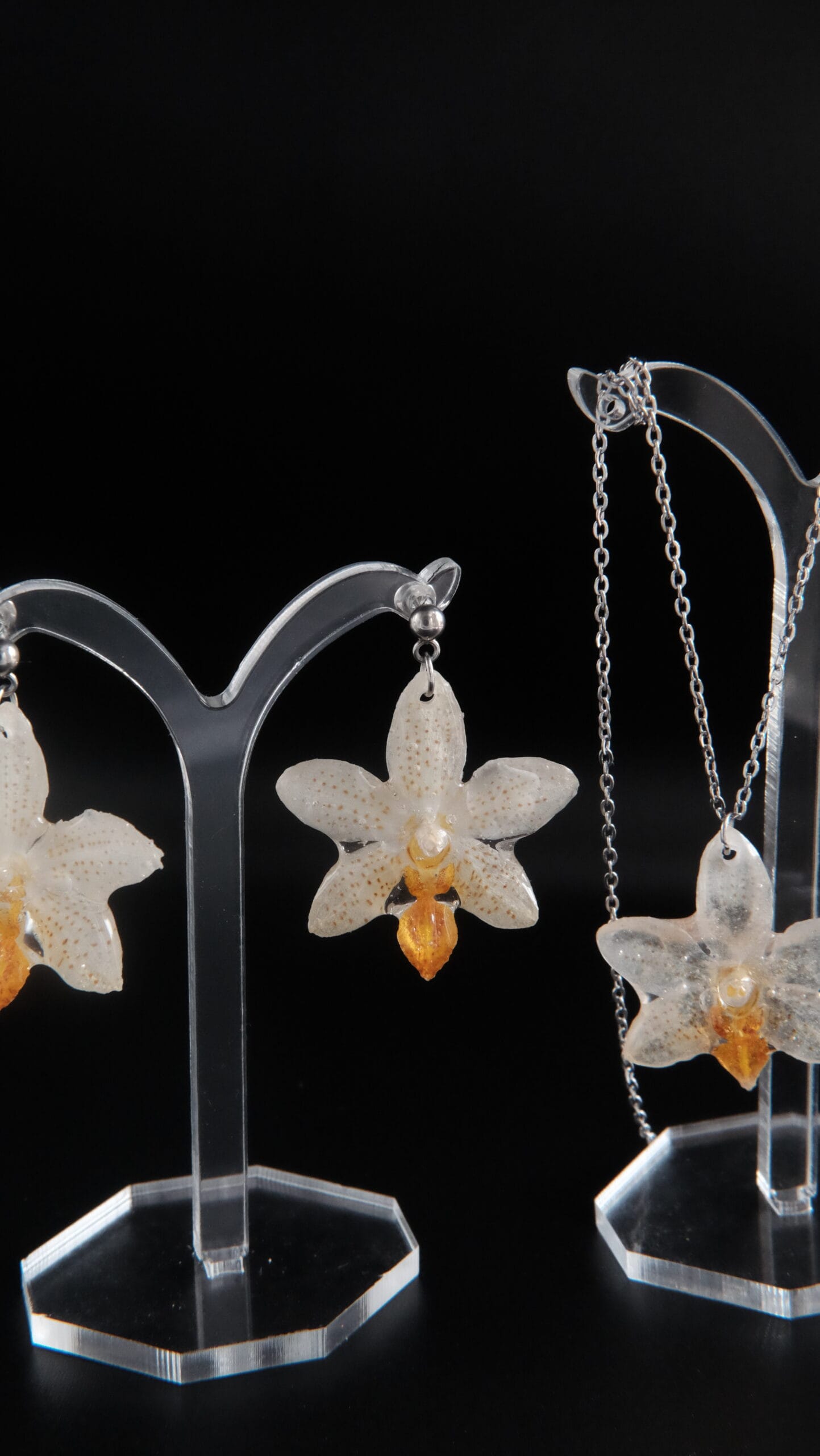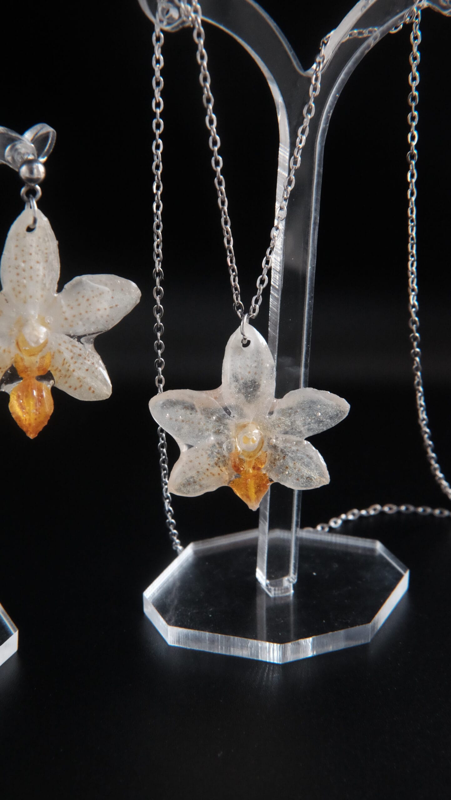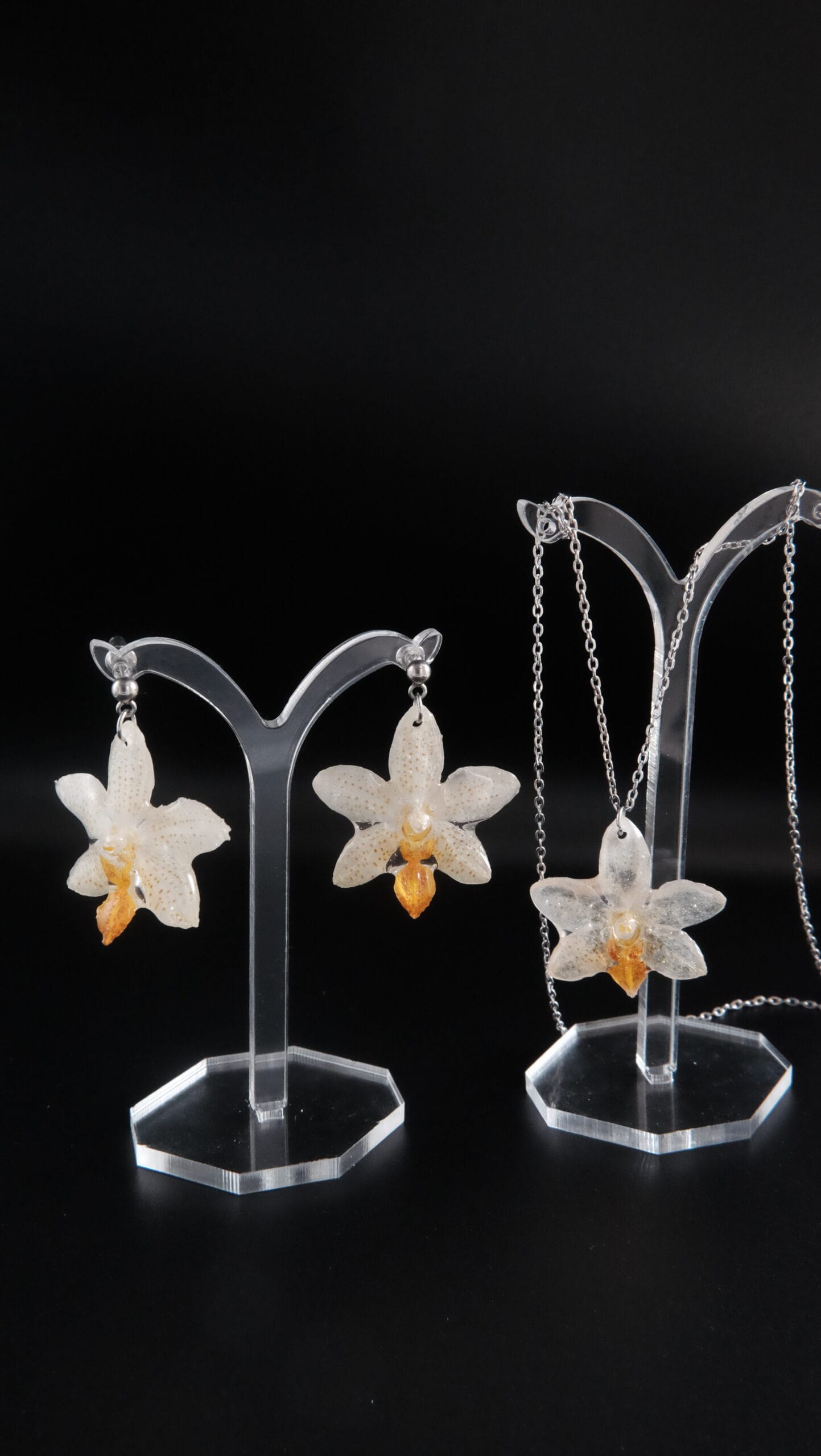 Compuesto de un collar de orquídea blanca y naranja mini de 50cm de longitud (si se necesita más largo, poner en notas de pedido cuánto exactamente y se añadirá sin coste adicional). Acompañado de unos pendientes con enganche de bolita a conjunto con el collar (puede cambiarse si se indica en notas de pedido).
