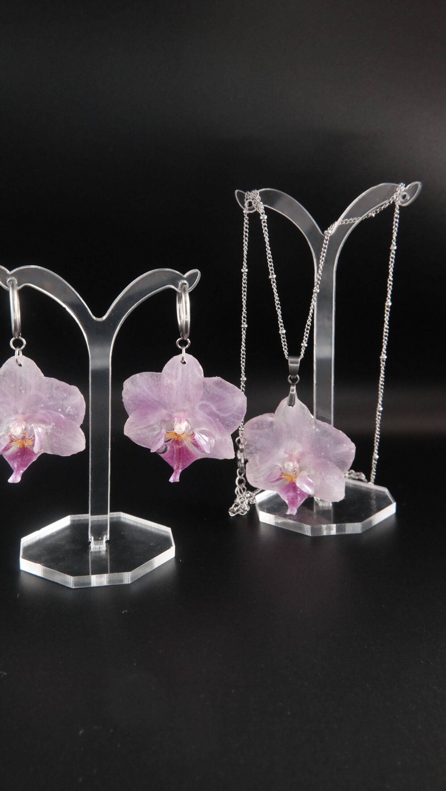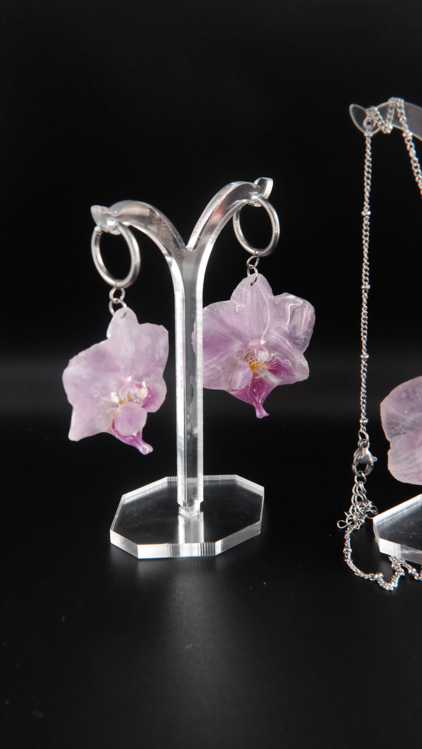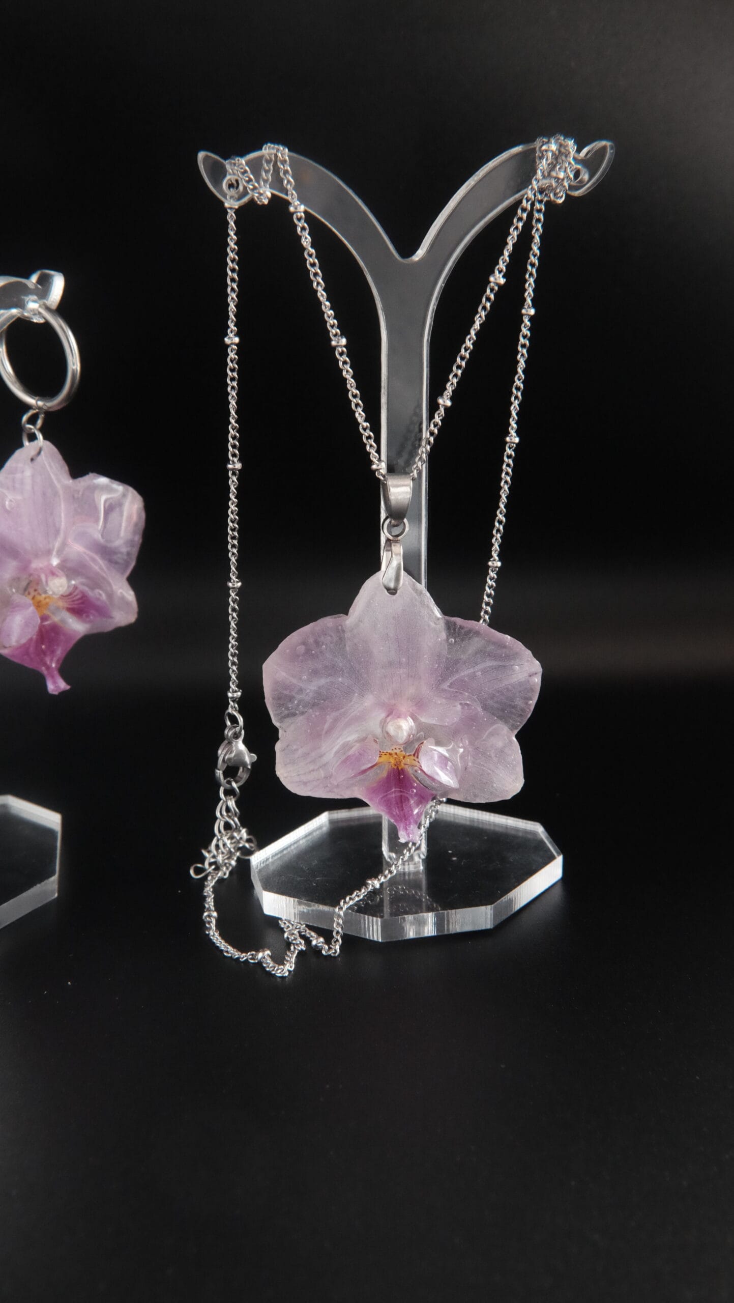 Compuesto de un collar de orquídea rosa mediana de 45cm de longitud (si se necesita más largo, poner en notas de pedido cuánto exactamente y se añadirá sin coste adicional). Acompañado de unos pendientes con enganche de aro a conjunto con el collar (si se quiere cambiar el tipo de enganche indicar en notas del pedido).