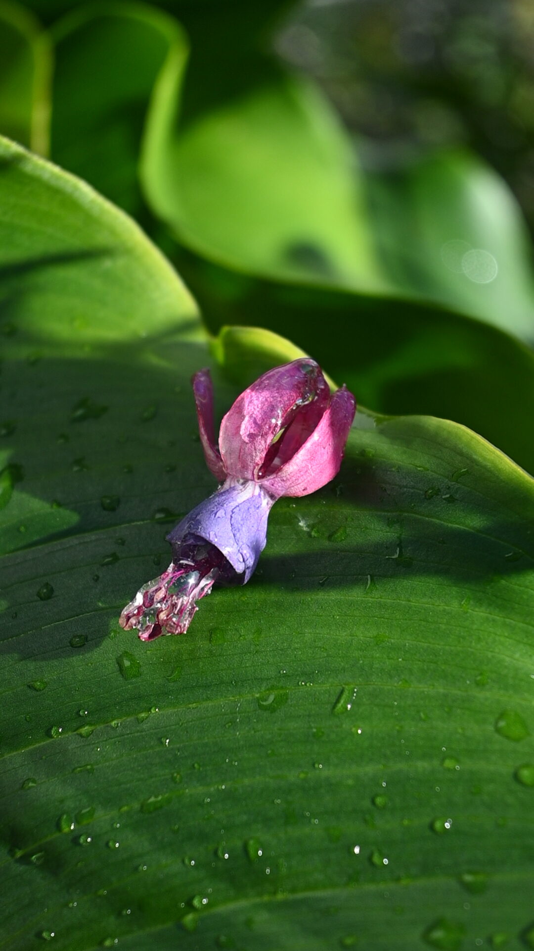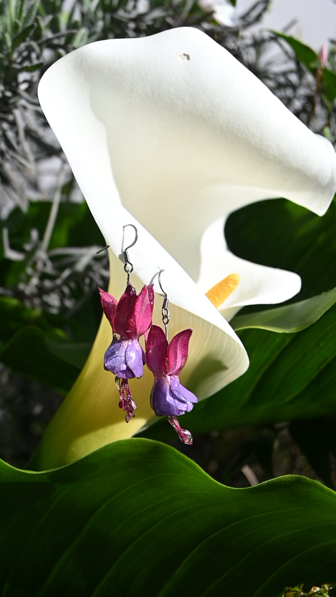 Pendientes hechos con la flor fuchsia (también conocida como pendientes de la reina) previamente secada y encapsulada en resina.