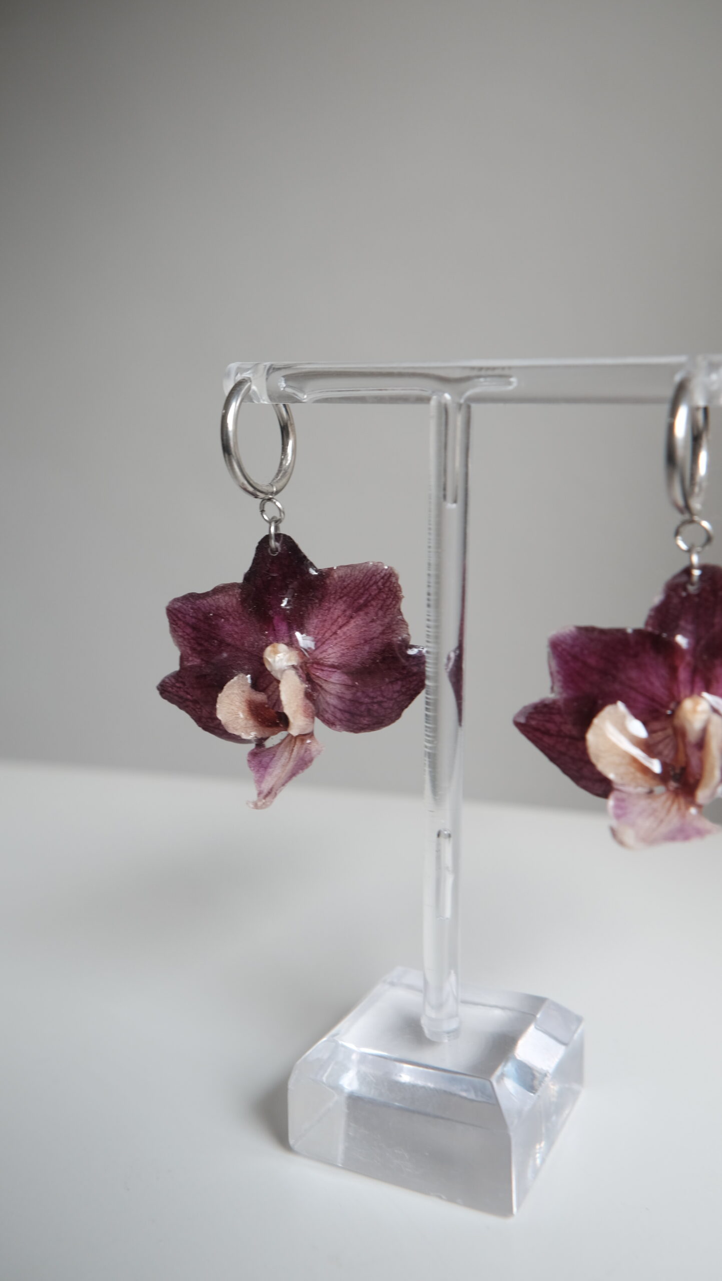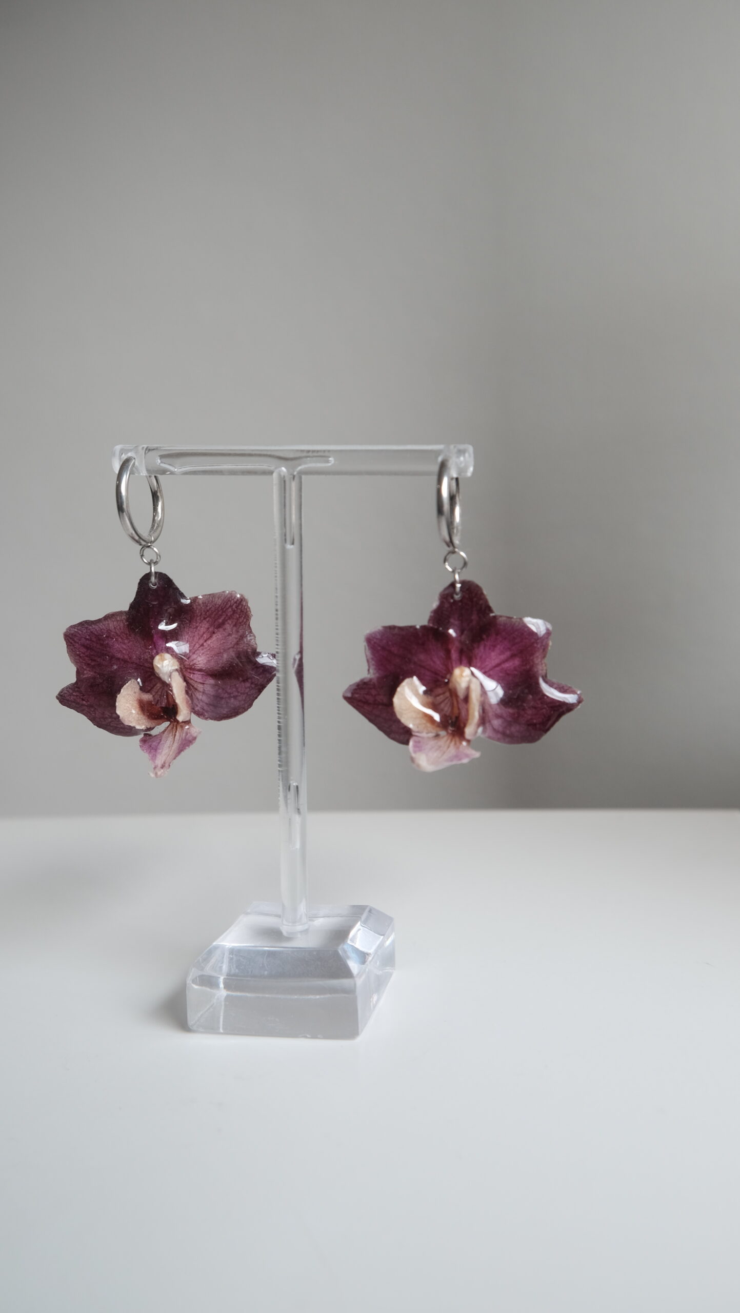 Pendientes hechos con orquídeas phalaenopsis de color burdeos reales.